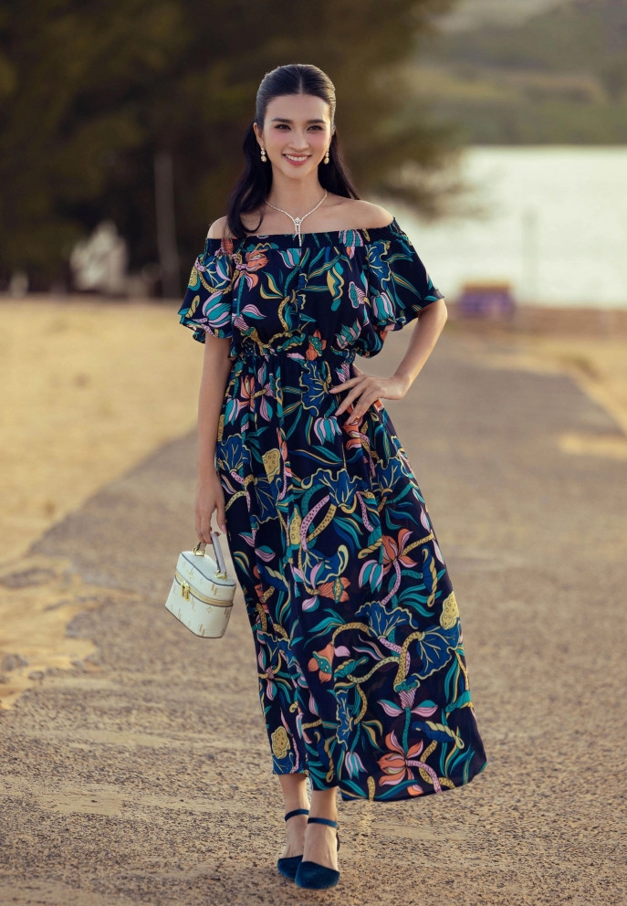 Kim Tuyến giữ vai trò vedette, giới thiệu mẫu váy maxi trễ vai đậm tinh thần mùa hè. Thần thái, sắc vóc trẻ trung của nữ nghệ sĩ U40 khiến nhiều đồng nghiệp, khán giả dành nhiều lời khen.